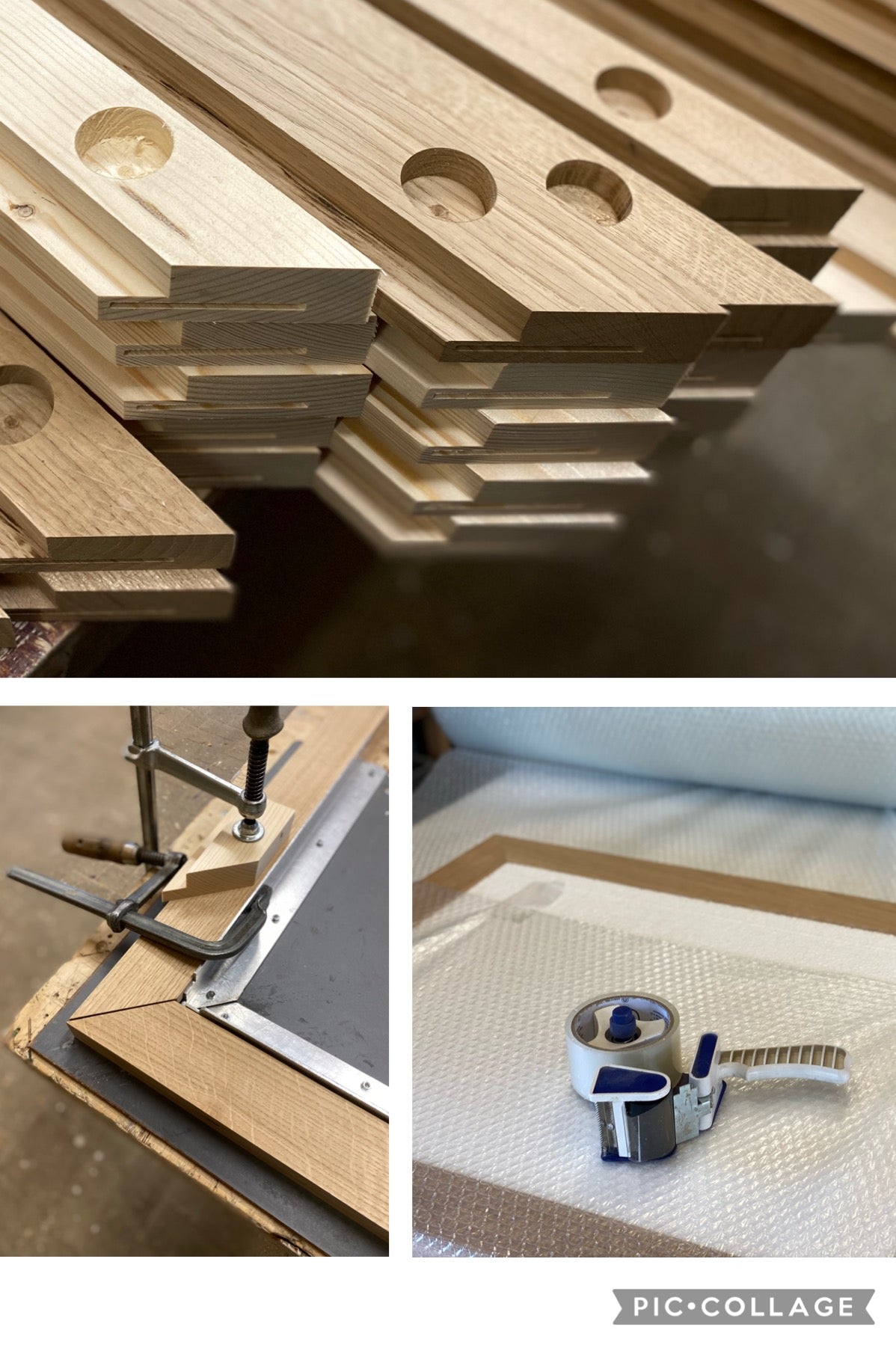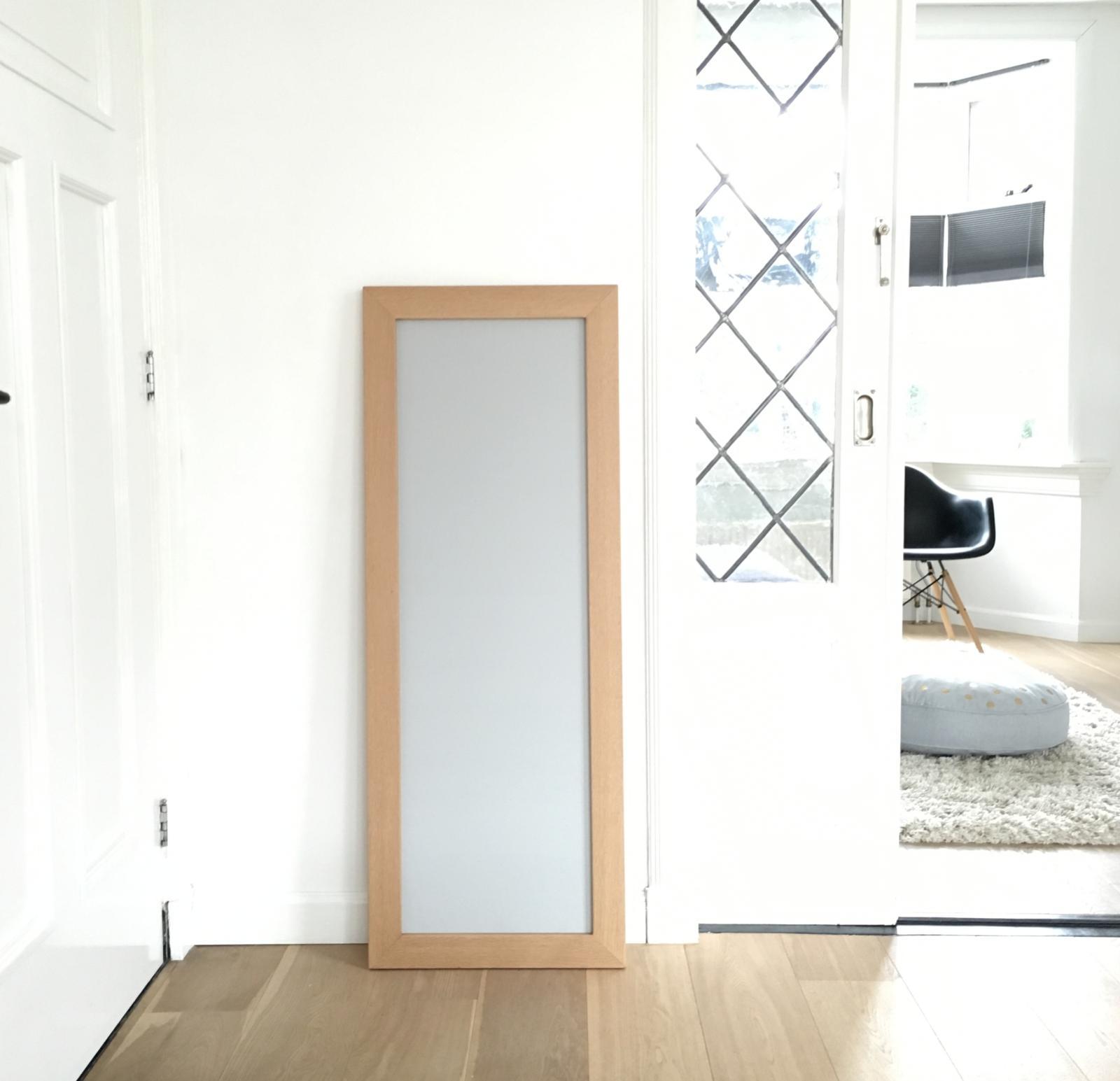Het eikenhout wordt door ons zorgvuldig uitgezocht en we behandelen de 7cm hoge omlijsting met een matte lak zodat de natuurlijke kleur mooi behouden blijft. De ophanging is onzichbaar weggewerkt, zodat je het prikbord strak aan de muur kan hangen.